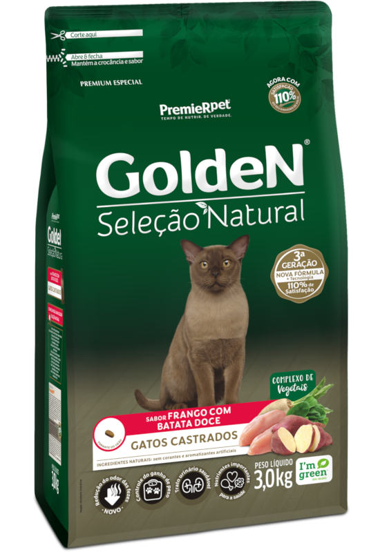 GoldeN Seleção Natural Gatos Castrados Sabor Frango com Batata Doce é indicado para gatos castrados a partir dos 6 meses de idade.