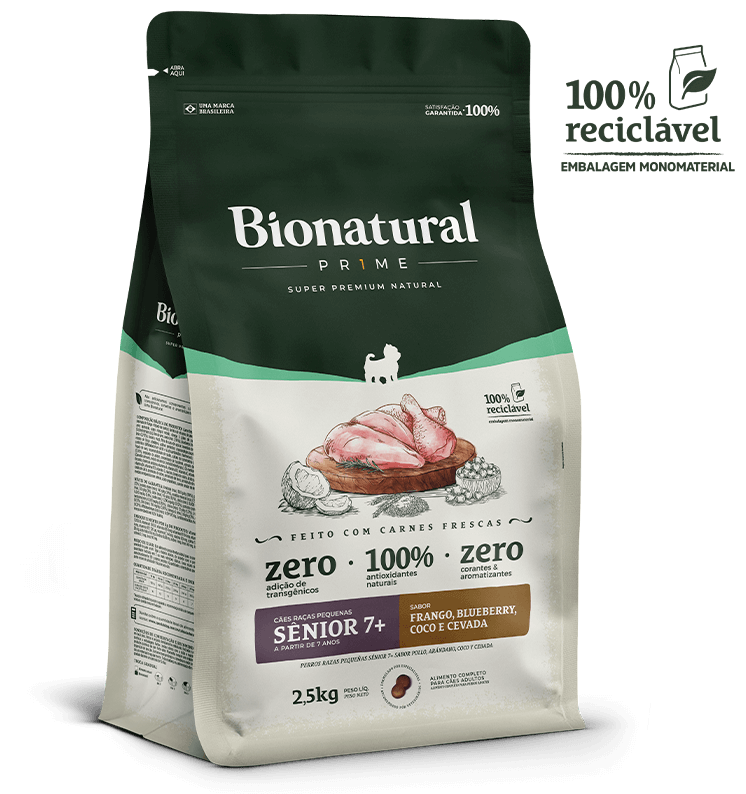 Carne fresca (mín. 3% - carne mecanicamente separada de frango e fígado de suínos), farinha de vísceras de aves, ovo em pó, plasma sanguíneo desidratado de suíno, arroz quebrado, sorgo integral moído, farinha de ervilha, ômega 3 [óleo de peixes e biomassa de microalgas (Schizochytrium sp.)], óleo de aves, grão de cevada (mín. 3,95%), blueberry (mirtilo mín. 0,015%), coco em flocos (mín. 0,015%), maçã, fibra de cana-de-açúcar, levedura de cervejaria inativada desidratada, extrato de Yucca schidigera, aditivo prebiótico (mananoligossacarídeos 0,006%), aditivos probióticos (Bifidobacterium lactis e Lacticaseibacillus rhamnosus), hidrolisado de carne de aves e fígado de aves, hexametafosfato de sódio, sulfato de condroitina (0,03%), sulfato de glicosamina (0,05%), regulador de acidez, concentrado de tocoferol, extrato de alecrim, extrato de chá verde (Camellia sinensis), extrato de menta, hortelã (Mentha spp.), DL-metionina, L-lisina, taurina, cloreto de sódio, cloreto de potássio, vitamina A, vitamina D3, vitamina E, vitamina K3, vitamina B1, vitamina B2, vitamina B6, vitamina B12, vitamina C, niacina, cloreto de colina, ácido pantotênico, ácido fólico, biotina, iodato de cálcio, proteinato de cobre, proteinato de ferro, proteinato de manganês, proteinato de zinco, levedura enriquecida com selênio, ácido propiônico, parede celular de levedura.