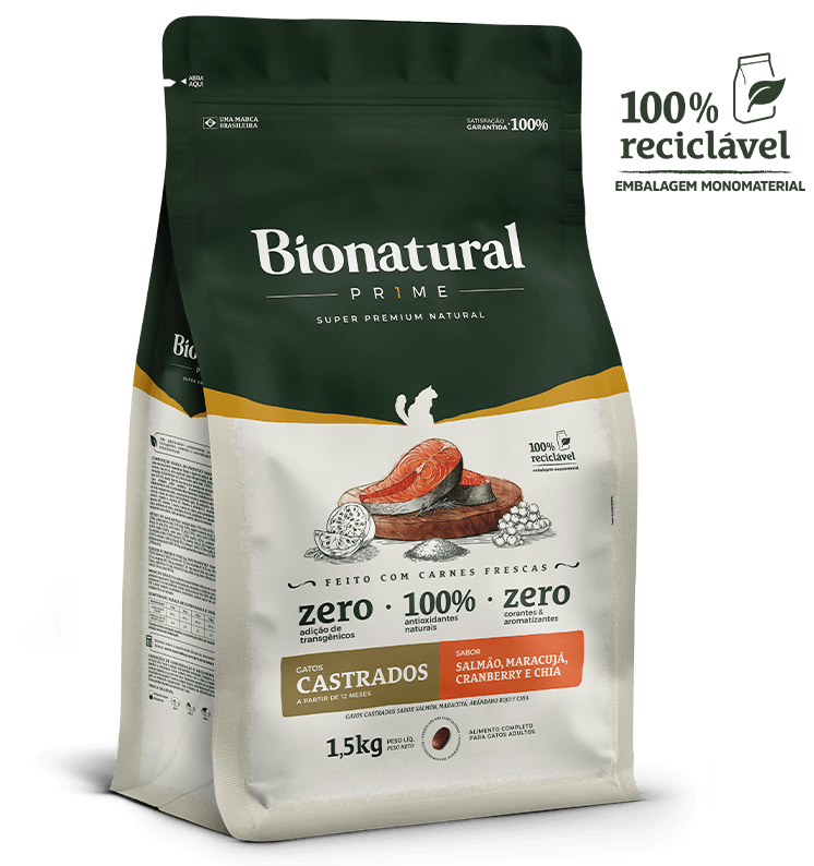 A Ração Bionatural Prime Gatos Castrados Salmão é ideal para felinos castrados, que necessitam de uma dieta especial para manter o peso adequado. Com um baixo teor calórico e a presença de L-carnitina, essa fórmula ajuda a controlar o ganho de peso, promovendo a queima de gordura e auxiliando na manutenção do peso saudável. Desenvolvida por médicos-veterinários, não possui corantes nem aromatizantes artificiais, oferecendo uma alimentação mais natural para o seu gato.