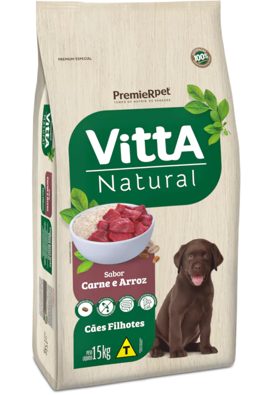 A linha Vitta Natural é formulada com proteínas de alta qualidade e é enriquecida com todas as vitaminas e minerais necessários para que os cães vivam saudáveis e felizes. Elaborado com ingredientes naturais e cuidadosamente selecionados, o produto Vitta Natural Filhotes Seleção de Carnes e Arroz, além de muito saboroso, não possui corantes e aromatizantes artificiais. Promove também a saúde intestinal dos filhotes, através da associação de fibras naturais com prebiótico.